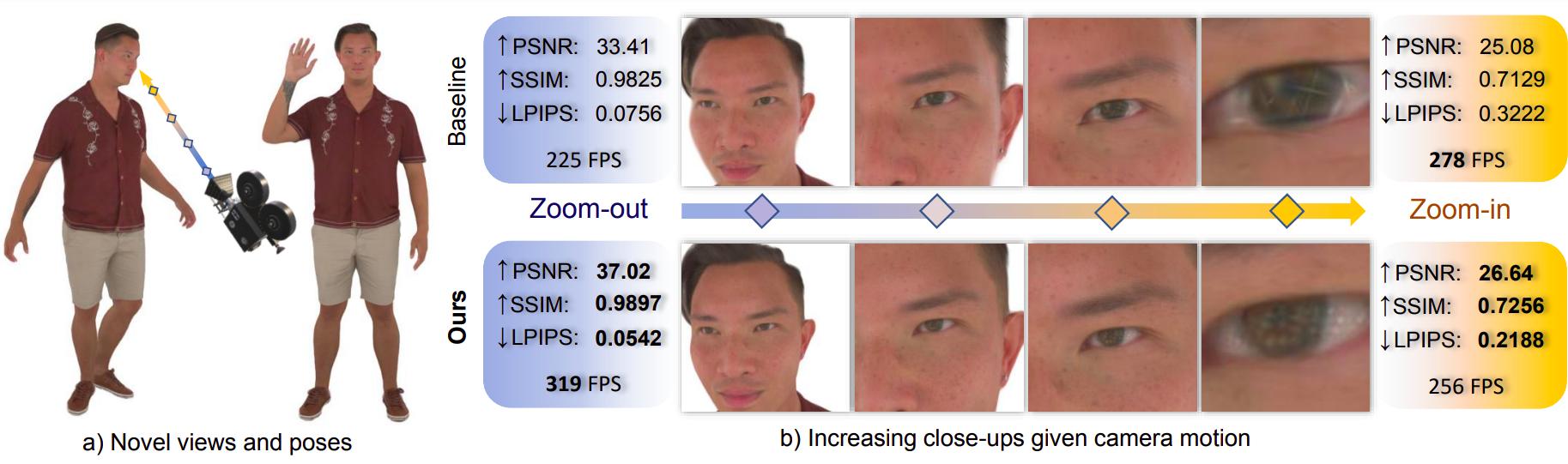 We provide experiments using the ActorsHQ dataset with high-resolution input images. CloseUpAvatar demonstrates both qualitative and quantitative improvements over existing methods in rendering from novel wide range camera positions, while maintaining high FPS by limiting the number of required primitives.